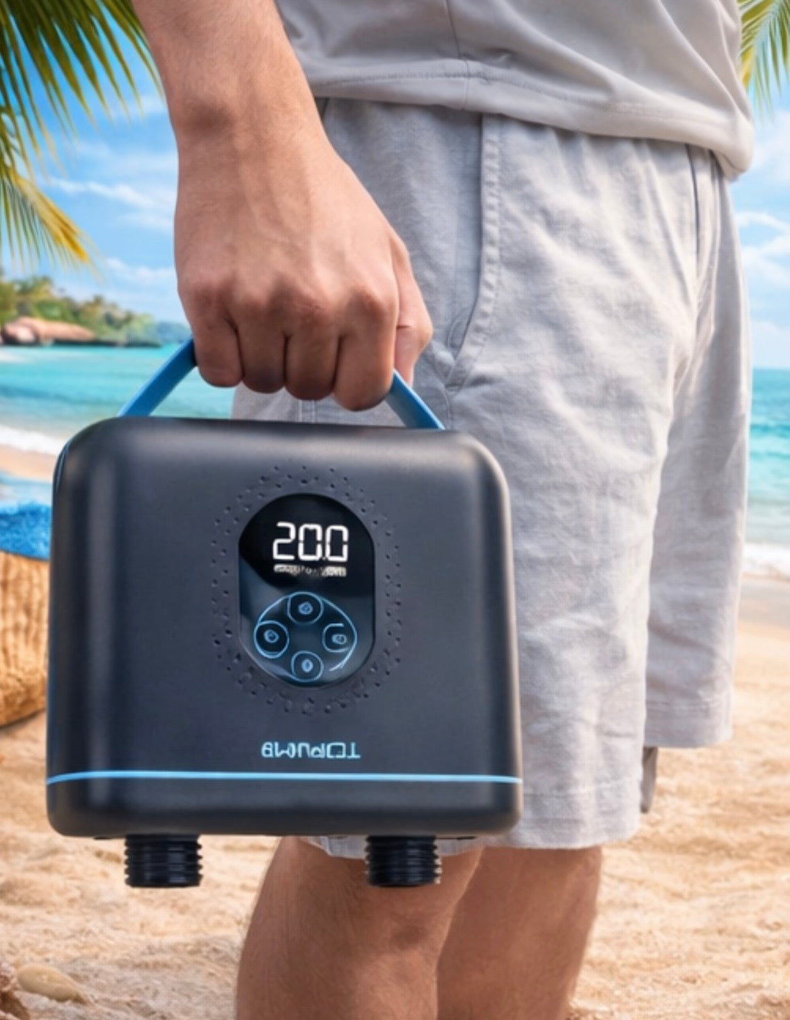 Dank des leistungsstarken 4000-mAh-Akkus lassen sich bis zu 3 SUP-Boards (10,5 ft) hintereinander aufpumpen. Das kompakte Design, der USB-C-Ladeanschluss und der kabellose Betrieb machen die D11PRO zum perfekten Begleiter für Strand, See und Reisen.